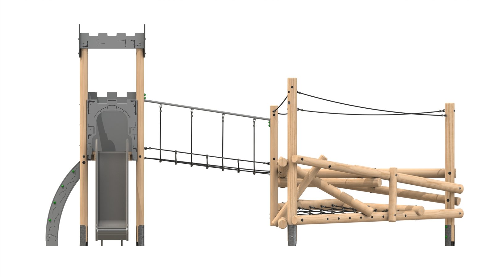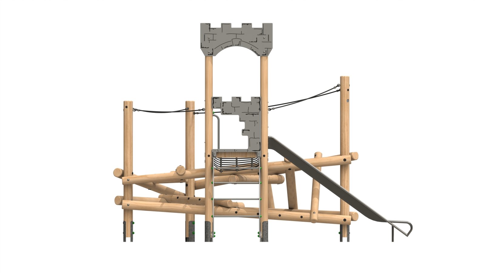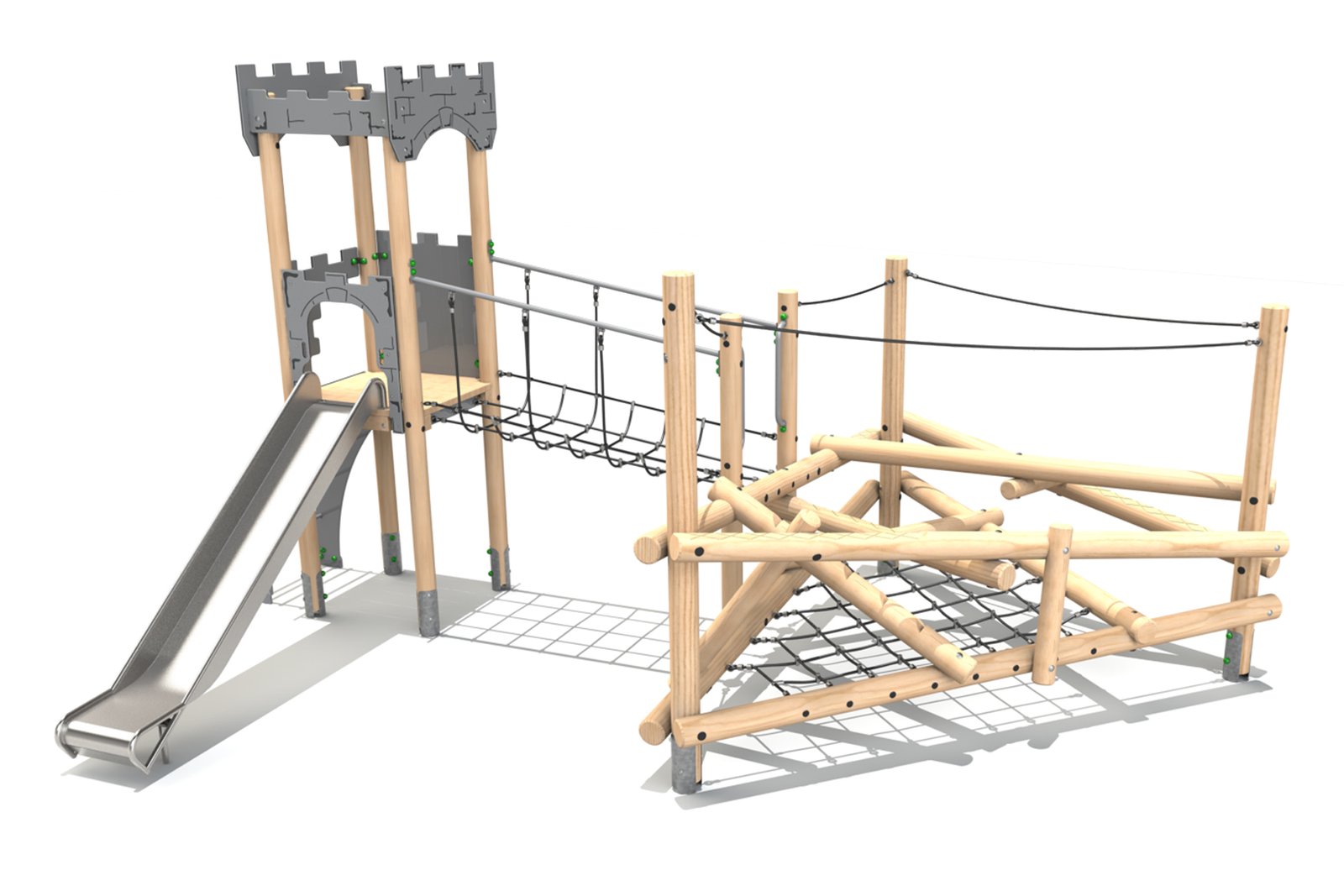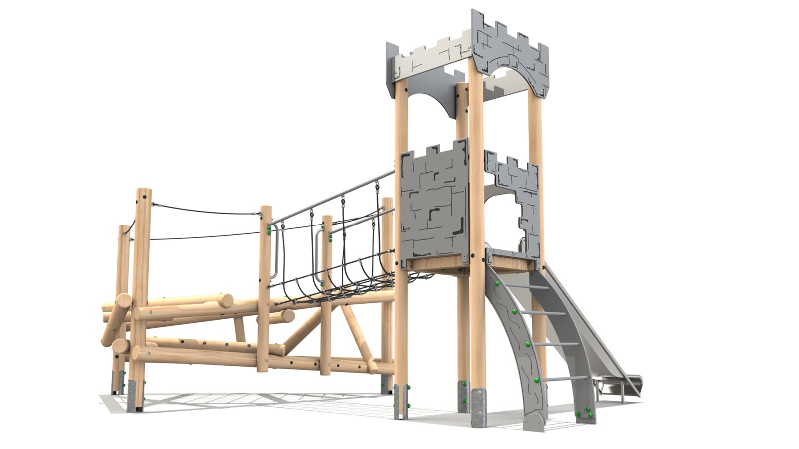 The Clamber Tower 2 Castle brings together active play and imaginative adventure in one striking, castle-themed play structure. Perfect for school playgrounds, parks, and outdoor attractions, this wooden playground equipment offers children the chance to climb, balance, and slide while exploring a fun and engaging castle environment. At the core of the Clamber Tower 2 Castle is a durable steel slide, providing children with a thrilling ride down after they’ve mastered the climb. The arch ladder challenges kids to develop strength and coordination as they work their way up to the tower, while the inclined rope bridge encourages balance and focus as they cross between platforms. For additional physical challenges, the Clamber Stack 2 gives children an obstacle-filled climb to the top, helping them build agility and confidence. To complete the castle experience, castle-themed panels decorate the structure, sparking imaginative play as children pretend to be knights, royalty, or adventurers in their very own fortress. This dynamic play structure promotes a wide range of physical benefits, including enhanced coordination, strength, and flexibility. The imaginative design fosters creativity and role-play, making it ideal for children who enjoy both active and imaginative play. The Clamber Tower 2 Castle also encourages social interaction, with kids taking turns, working together, and inventing new ways to navigate the structure. Durably constructed from high-quality timber, the Clamber Tower 2 Castle is built to withstand the demands of outdoor play while providing a safe and exciting environment for children to explore. Its combination of climbing, sliding, and balancing activities ensures hours of fun, while its castle theme will inspire creativity and teamwork. If you're looking for wooden playground equipment that offers a perfect balance of physical challenge and imaginative play, the Clamber Tower 2 Castle is the ideal choice for any school playground or outdoor space. Let children experience the joy of active play while exploring the exciting world of their very own castle!