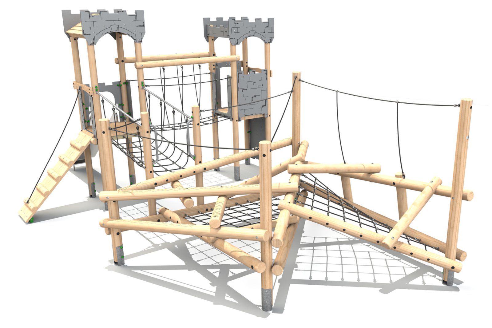 The Clamber Tower 3 Double Deck Castle is a magnificent, multi-level play structure that combines thrilling physical challenges with imaginative castle-themed play. Perfect for school playgrounds, parks, and outdoor attractions, this wooden playground equipment offers children hours of active play, while fostering teamwork, coordination, and creativity. At the heart of this grand castle structure is a high-quality steel slide, providing an exhilarating way for children to race down after they’ve completed their climb. The two levels of the tower offer even more excitement, with an access ramp to make it easy for children to ascend to the upper deck. Once at the top, the inclined rope bridge gives them a fun, balancing challenge as they cross from one platform to another. For those looking to test their skills, the rope challenge crossing adds an extra layer of difficulty, requiring focus and coordination as children move across the rope. The fireman’s pole provides a thrilling way to descend quickly, encouraging upper body strength and agility. Meanwhile, the climb wall offers a vertical challenge that helps children build strength and confidence as they climb their way to the top. The Clamber Stack 3 adds another climbing challenge, with stacked timber obstacles perfect for developing agility and problem-solving skills. This exciting mix of climbing, balancing, and sliding encourages children to stay active while building essential motor skills, coordination, and confidence. Designed with castle-themed panels, the Clamber Tower 3 Double Deck Castle ignites children’s imaginations as they pretend to be knights, royalty, or brave adventurers exploring the castle's many features. The upper level even features a roof, providing a covered area for rest or further imaginative play as they look out over their kingdom. Durable and built to last, the Clamber Tower 3 Double Deck Castle is crafted from high-quality timber, ensuring long-term use and safety. Its combination of physical challenges, imaginative play elements, and vibrant castle design makes it an ideal addition to any outdoor playground. If you’re looking for wooden playground equipment that offers the perfect mix of physical activity and imaginative play, the Clamber Tower 3 Double Deck Castle is the ultimate choice. With its variety of climbing challenges, thrilling slides, and castle-themed fun, it will captivate children’s imaginations and keep them engaged in active, healthy play for hours.