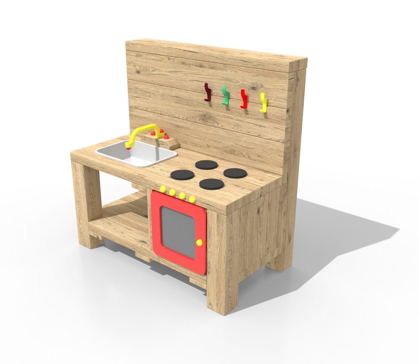 Children can use the various built-in features, such as sinks, work surfaces, and storage, to create their own "mud pies," sandcastles, or water-based creations. The kitchen provides endless opportunities for imaginative play, allowing children to mix, stir, and experiment with natural materials like mud, sand, and water, while developing important sensory skills, hand-eye coordination, and social interaction.