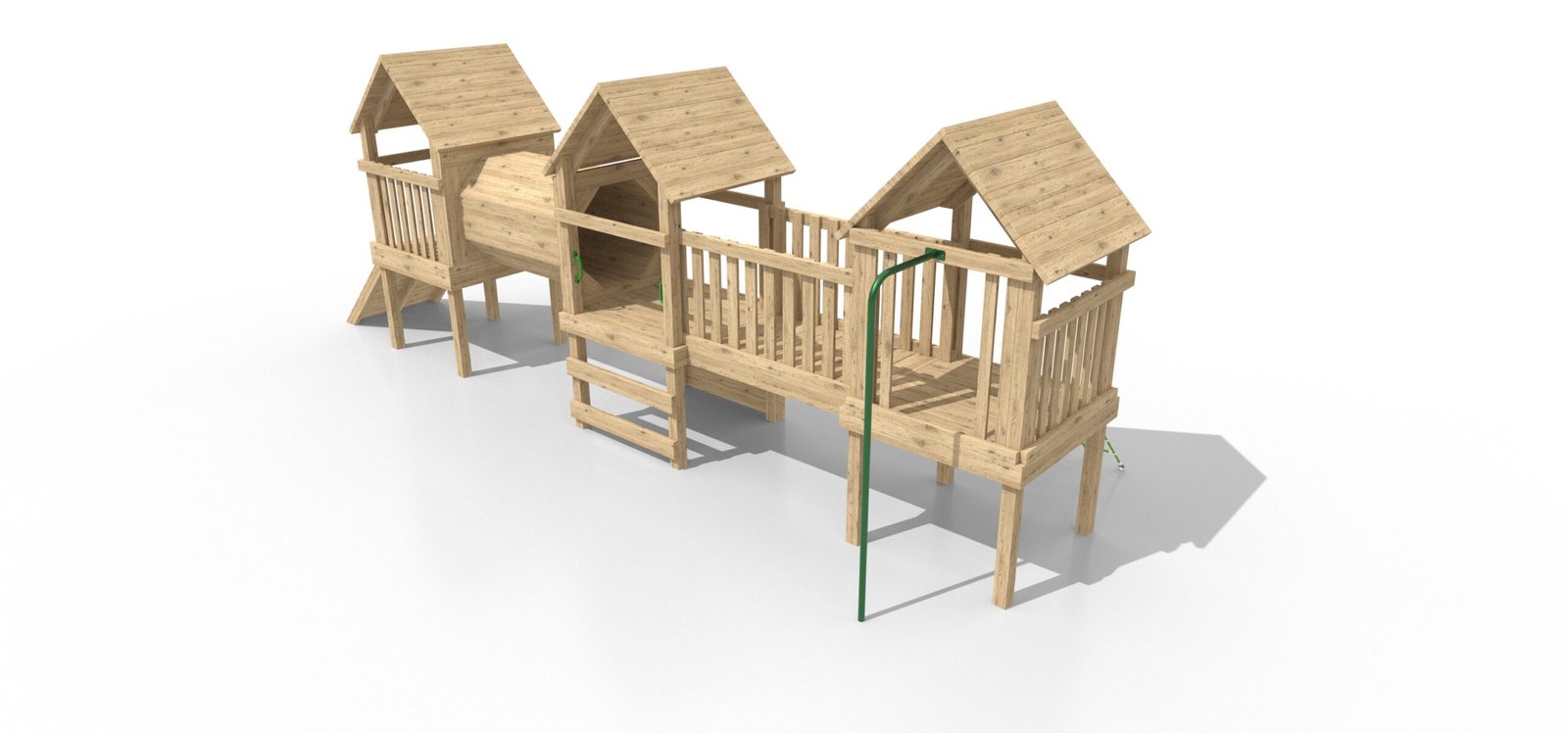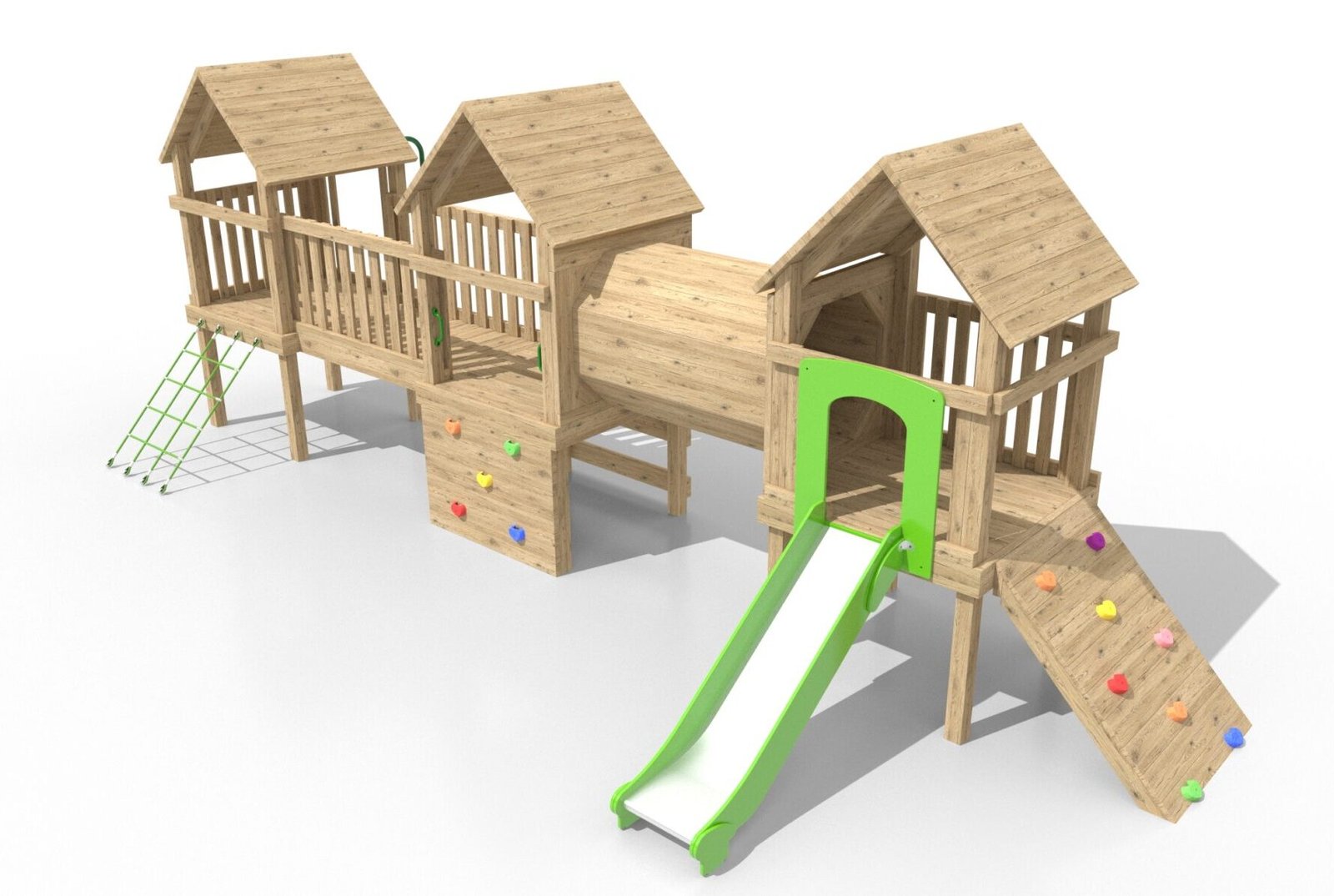 Each of the three towers is equipped with a mix of exciting features. The first two towers are joined by a robust timber bridge, allowing children to balance and walk across. The third tower is connected to the second by a timber tunnel, encouraging crawling and exploration. In addition, the unit includes a rock climber on two of the towers, giving children the opportunity to climb and develop strength, coordination, and confidence.
